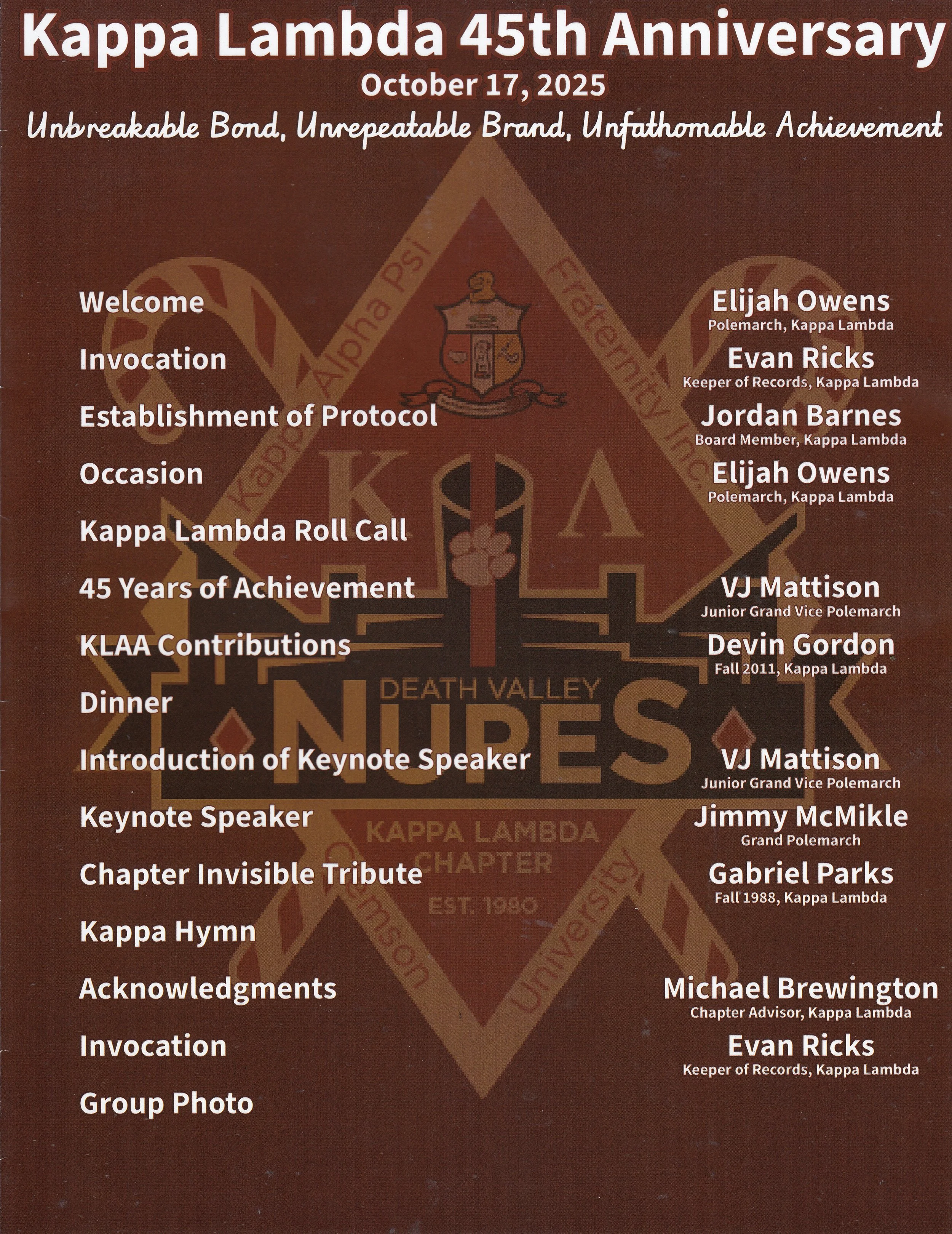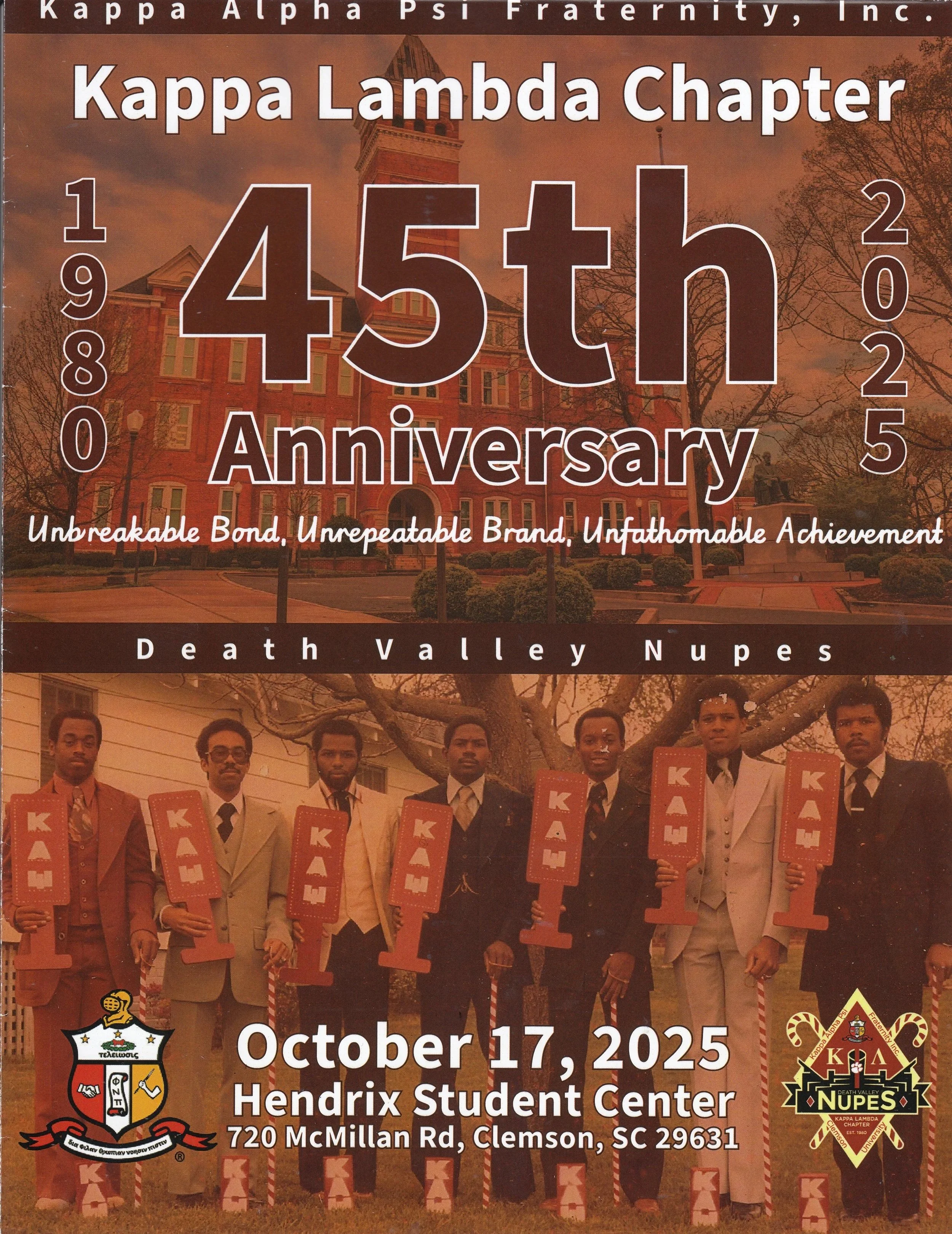 The Kappa Lambda Chapter of Kappa Alpha Psi Fraternity Incorporated was chartered at Clemson University on October 16, 1980, by seven trailblazing men. They were Brothers, Patrick Bingham, Michael Brewington, David Culp, Wallace Glenn, Alfred Lindsey, Ronald Reeves, and Bernard Shell.